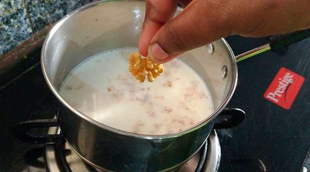 దీని కోసం పొయ్యి వెలిగించి గిన్నె పెట్టి ఒక గ్లాస్ పాలను పోసి కాస్త వేడి అయ్యాక 5 కిస్ మిస్ లను శుభ్రంగా కడిగి చిన్న చిన్న ముక్కలుగా కట్ చేసి వేయాలి. అలాగే 3 వాల్ నట్స్ ని కూడా శుభ్రంగా కడిగి ముక్కలుగా కట్ చేసి వేసి 5 నుంచి 7 నిమిషాల వరకు మరిగించాలి. ఈ విధంగా మరగటం వలన కిస్ మిస్, వాల్ నట్స్ లో ఉండే పోషకాలు పాలల్లోకి చేరతాయి.