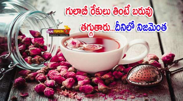 గులాబీ రేకులను తింటే బరువు తగ్గుతారు. అధిక బరువు సమస్య ఉన్నవారికి గులాబీ రేకులు మంచి ఫలితాన్ని ఇస్తాయి. అయితే గులాబీ రేకులను కొంచెం క్రష్ చేసి నీటిలో వేసి బాగా మరిగించి ఆ నీటిని వడగట్టి తేనె కలుపుకొని తాగాలి.ఈ విధంగా ప్రతి రోజు తాగుతుంటే కొవ్వు కరుగుతుంది.