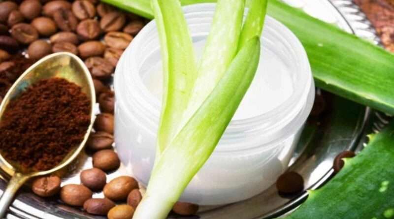 దీని కోసం కలబందను తీసుకొని సైడ్స్ లో ఉండే బాగాన్ని కట్ చేసి చిన్న చిన్న ముక్కలుగా కట్ చేసి మిక్సీ జార్ లో వేయాలి. ఈ ముక్కలు ఒక కప్పు ఉండేలా చూసుకోవాలి. దీనిలో ఒక స్పూన్ కాఫీ పొడి, ఒక స్పూన్ టీ పొడి వేసి అవసరమైన నీటిని పోసి మెత్తని పేస్ట్ గా చేసుకోవాలి.