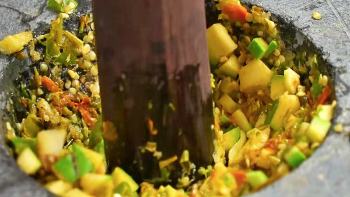 పొయ్యిపై పాన్ పెట్టి 4 టేబుల్ స్పూన్ల నూనె వేసి వేడి చేసి పచ్చిమిర్చిని వేసి మగ్గించాలి. వేయించిన పచ్చిమిర్చి, పచ్చి వెల్లుల్లి, ఉప్పును రోటిలో కచ్చాపచ్చాగా దంచండి. ఆ తర్వాత పుల్లటి మామిడికాయ ముక్కలు వేసి మళ్లీ దంచండి. తర్వాత ఉల్లిపాయ ముక్కలు, వేయించిన వేరుశనగ గుండ్లు వేసి బాగా దంచండి.