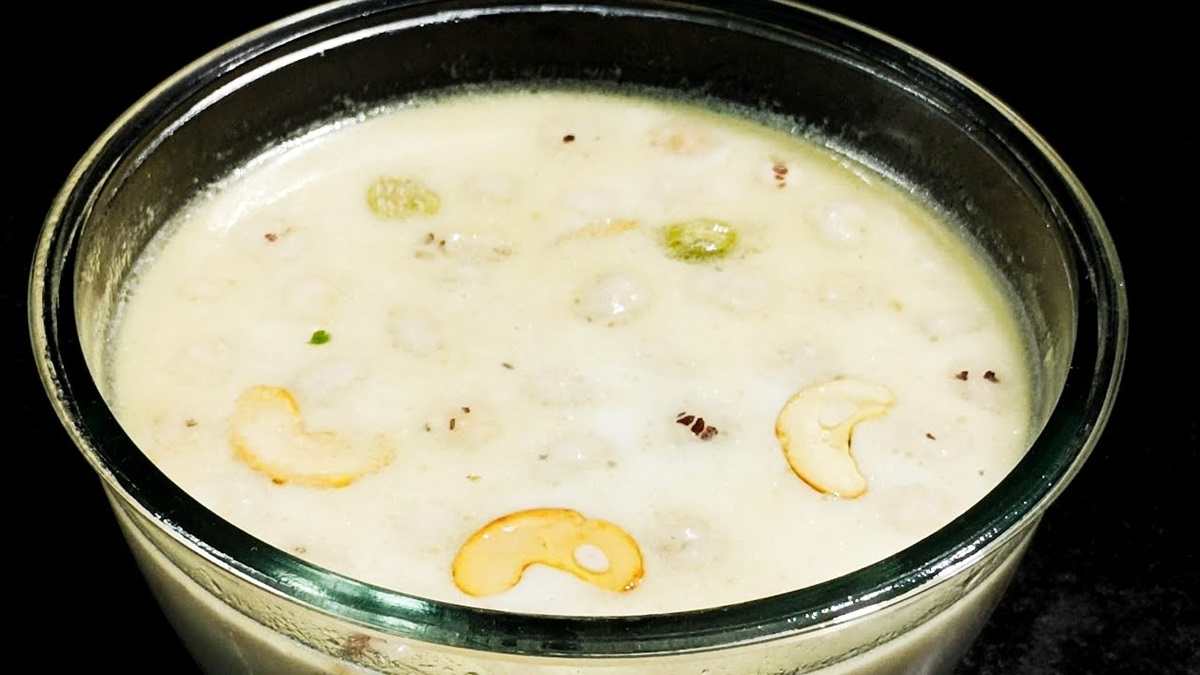 ఒక కళాయిలో నెయ్యి వేసి కాగిన తర్వాత జీడిపప్పు, ఎండుద్రాక్షలను వేయించి పక్కన పెట్టుకోవాలి.మరో కళాయిలో 1 లీటరు నీరు పోసి, కాగిన తర్వాత సగ్గు బియ్యం వేసి ఉడికించాలి.సగ్గు బియ్యం ఉడికిన తర్వాత, పాలు, చక్కెర, యాలకుల పొడి, చిటికెడు ఉప్పు వేసి, పాలు కాగే వరకు 15 నిమిషాలు ఉడికించాలి.