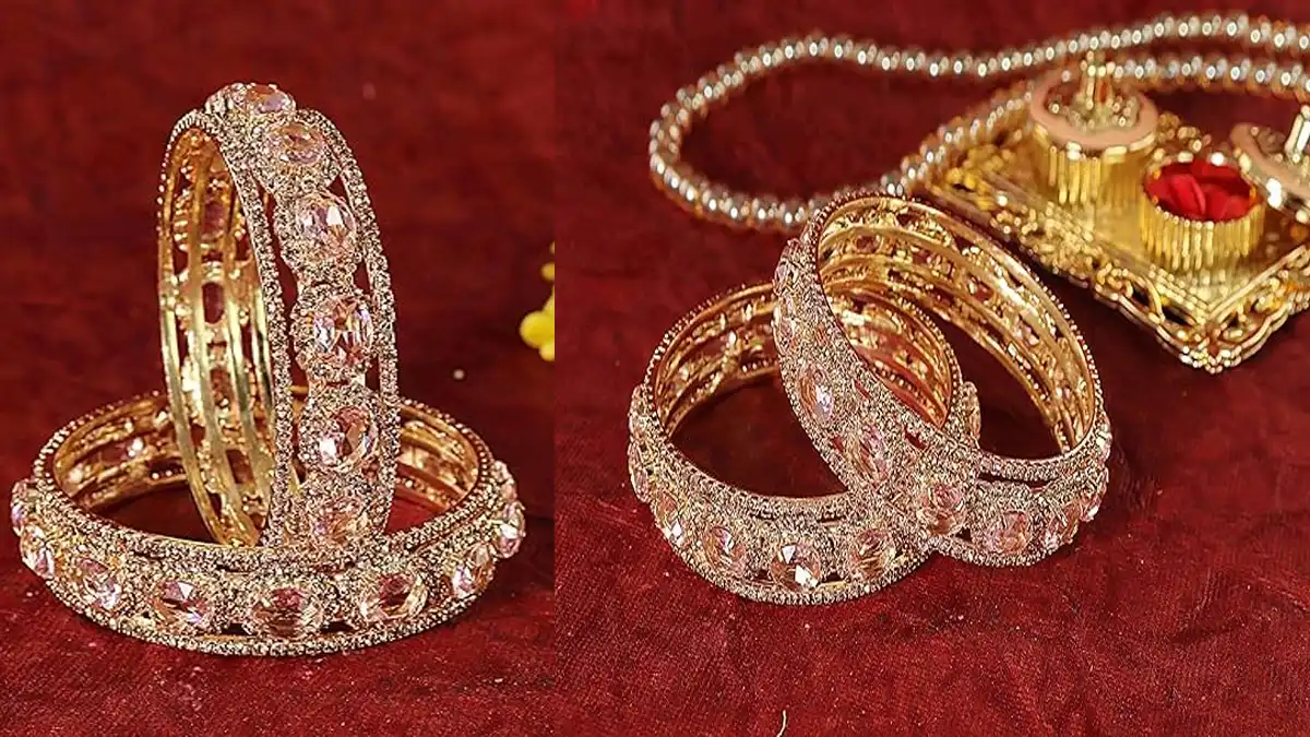 American Diamond & Zircon స్టోన్స్‌తో చేసిన ఈ బంగిల్స్, డైలీ ఆఫీస్ వేర్ నుంచి పార్టీ వేర్ వరకూ అన్నింటికీ సరిపోతాయి.లైట్‌వెయిట్ డిజైన్ – రోజూ వేసుకోవడానికి ఈజీగా ఉంటుంది. రియల్ గోల్డ్ ఫినిష్‌తో, ఫెస్టివల్స్ & ఫంక్షన్స్‌లో కూడా గ్లామరస్‌గా కనిపిస్తాయి.