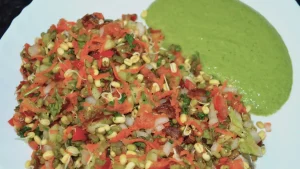 1 కప్పు మూంగ్ దాల్‌ను 24 గంటలు నీటిలో నానబెట్టి, మొలకెత్తించండి.మొలకలను ఒక గిన్నెలో తీసుకుని, 1/4 కప్పు తరిగిన ఉల్లిపాయ, 1/4 కప్పు టమాటా, 2 టేబుల్ స్పూన్ల కొత్తిమీర కలపండి.ఉప్పు, చాట్ మసాలా, 1 టేబుల్ స్పూన్ నిమ్మరసం వేసి కలపండి.వెంటనే సర్వ్ చేయండి.
