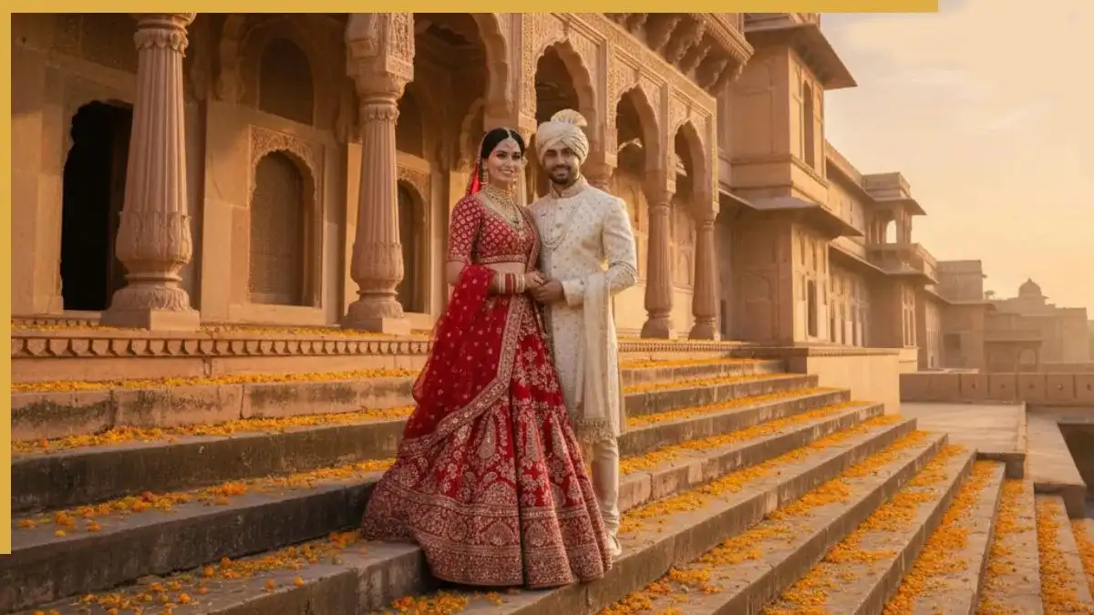 In this breathtaking 4K HD scene, the Taj Mahal stands resplendent under the fiery hues of a sunset sky, its ivory-white marble glowing with warm pinks and oranges. The Indian couple stands in the foreground, perfectly framed by the monument’s iconic dome and minarets. The bride is a vision in a red lehenga, its intricate gold embroidery sparkling as it catches the fading light. Her dupatta flows gently in the breeze, adorned with delicate zari work. The groom, dashing in a cream sherwani with subtle gold accents, stands tall beside her, his hand resting lightly on her waist. Their expressions are tender, a mix of awe and love, as they gaze at each other against the grandeur of the Taj. Scattered rose petals, in shades of red and pink, drift across the marble courtyard, carried by a soft wind, adding a dreamy, cinematic touch. The sunset casts long shadows, blending the couple’s silhouettes with the monument’s timeless beauty. The scene is vibrant yet intimate, with the warm lighting and soft focus on the distant gardens enhancing the romantic, larger-than-life atmosphere.