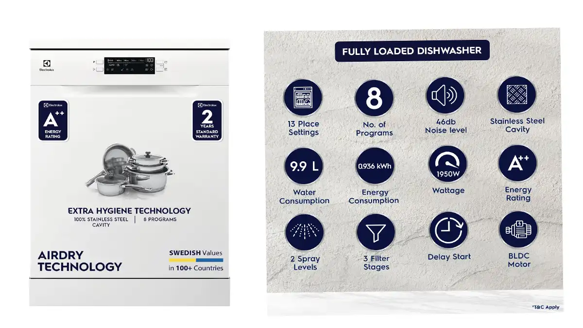 మోడల్: ESA47220SW (13 ప్లేస్ సెట్టింగ్స్, ఫ్రీస్టాండింగ్).. ఇంటి యూజ్కి పర్ఫెక్ట్ డిజైన్. ఫుల్ ఆటోమేటిక్, ఇన్బిల్ట్ హీటర్తో పాత్రలు డ్రై & షైనీ. కలర్: కూల్ వైట్.