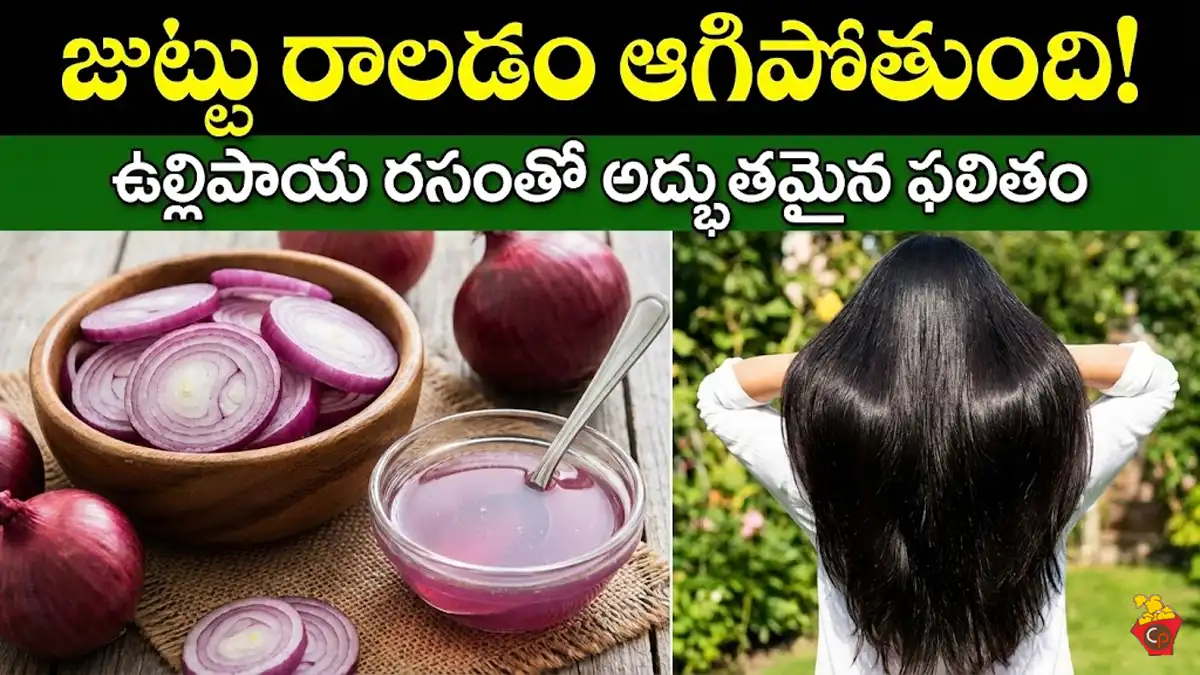 Keywords: “Onion Juice for Hair Growth Telugu”, “Stop Hair Fall Naturally”, “Ullipaya Rasam Hair Tips”, “Thick Hair Home Remedies”.