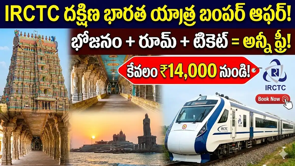 IRCTC బంపర్ ఆఫర్: కేవలం రూ.14 వేలకే ‘దక్షిణ భారత యాత్ర’.. భోజనం, రూమ్, టికెట్ అన్నీ కవరే..దక్షిణ భారతదేశంలోని ప్రసిద్ధ పుణ్యక్షేత్రాలను ఫ్యామిలీతో కలిసి ప్రశాంతంగా దర్శించుకోవాలని ప్లాన్ చేస్తున్నారా? రైలు టికెట్ల వెయిటింగ్ లిస్ట్, హోటల్ రూమ్స్ కోసం ఎదురుచూపులు లేకుండా, కాలు కిందపెట్టకుండా అన్నీ వాళ్లే చూసుకునేలా ఇండియన్ రైల్వేస్ (IRCTC) ఒక అద్భుతమైన ఆఫర్ ప్రకటించింది.